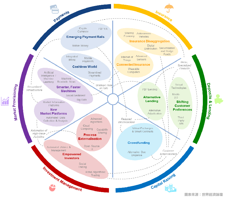 2015年6月的世界經濟論壇,即針對金融服務的未來,邀請了197位來自全球重要的金融業社群、創新社群、學術界以及FinTech新創事業等的行業領導者及創新領袖,在香港、天津、波士頓、紐約、倫敦和達佛斯等六個城市舉辦大型工作坊,經過長達15個月的研究,提供了一份長達178頁的詳盡報告(原始連結),試圖回答FinTech創新所衍生的三個問題: