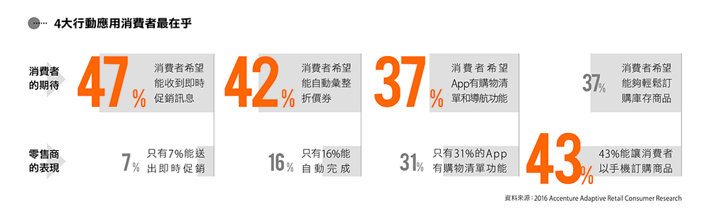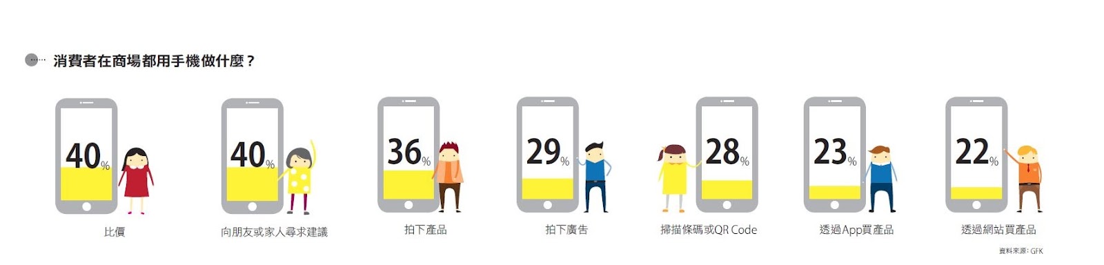 消費者會事先調查產品細節,包括尺寸、規格、庫存狀態,也會比較產品價格或運費。此外,消費者高度依賴行動裝置,18%消費者會因為在手機上看到更便宜的商品而離開實體店面,28%的線上交易發生在手機或平板(2015年5月數據)。